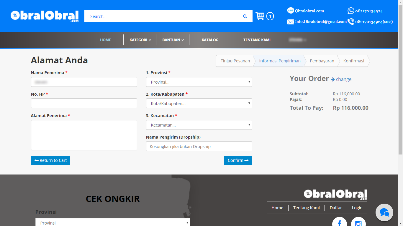 6. Pada tampilan Checkout, isilah setiap kolom sesuai dengan data Anda, jika sudah Anda dapat menekan "Confirm" jika ingin meninjau ulang pesanan Anda, Anda dapat mengklik "Return to Cart", Isi bagian Nama Pengirimin jika ingin dropship, jika tidak di isi maka akan dikirim dengan nama penerima