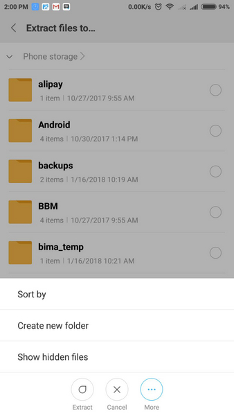 9. Kemudian pilih More > Create New Folder > buatlah sebuah folder khusus untuk menempatkan hasil extract. Kemudian pilih folder tersebut dan tekan "Extract" yang ada di bawah.