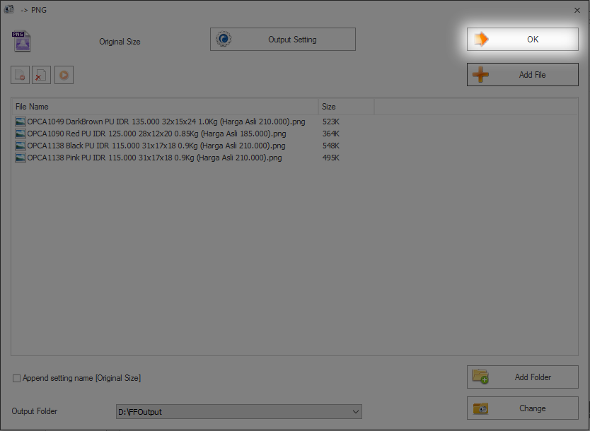 13. Pilih foto yang Anda inginkan, berikut adalah contoh 4 foto tas format .JPG yang akan di convert menjadi .PNG :