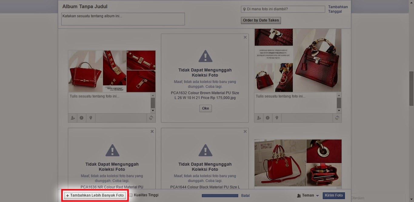2. Klik +Tambahkan Lebih Banyak Foto , lalu pilih foto yang bermasalah tadi dan kemudian upload kembali. Lakukan berulang kali sampai bisa di upload.